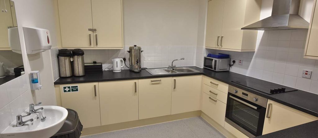 Main room: Ground level with full disabled access via the lobby entrance. The room contains four floor-to-ceiling windows, two of which include glazed doors and all of which include top lights for ventilation. A projector and retractable screen are available for presentations. Full-height cupboards store folded tables and stackable chairs when they are not in use. 60 chairs and 20 tables. Free Wi-Fi is available. The WC is accessed from the lobby and is sized and designed to allow for disabled access. It also has a baby changing table.